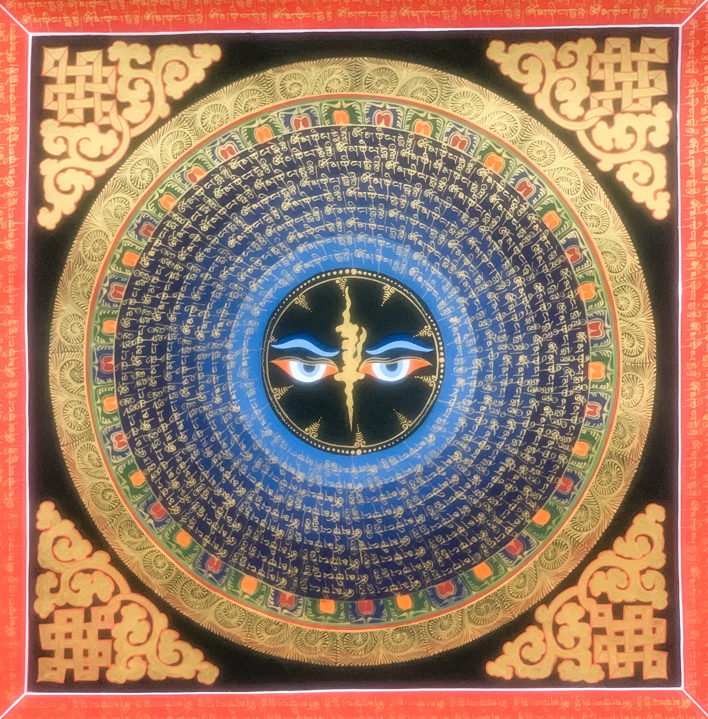 This is a master Quality Black and Gold Buddha Eye and Om Mantra Mandala Tibetan Thangka painting. The Mandala is painted with Buddha's Eye in the Center and Om Mani Padme Mantra in the circle. The Mandala is a symbolic representation of cyclical existence. This Mandala is painted with gold and natural stone color. Size of the painting: 20 x 20 Inch ( 50 x 50 cm) Material: Handmade Cotton Canvas Color: Gold, Natural, Stone color, Tibetan Glue, Shipping: Free Standard Shipping with International Tracking Number. Duty and Taxes: As applicable by the country of destination. Etsy Collects Tax/VAT for most countries while checking out.