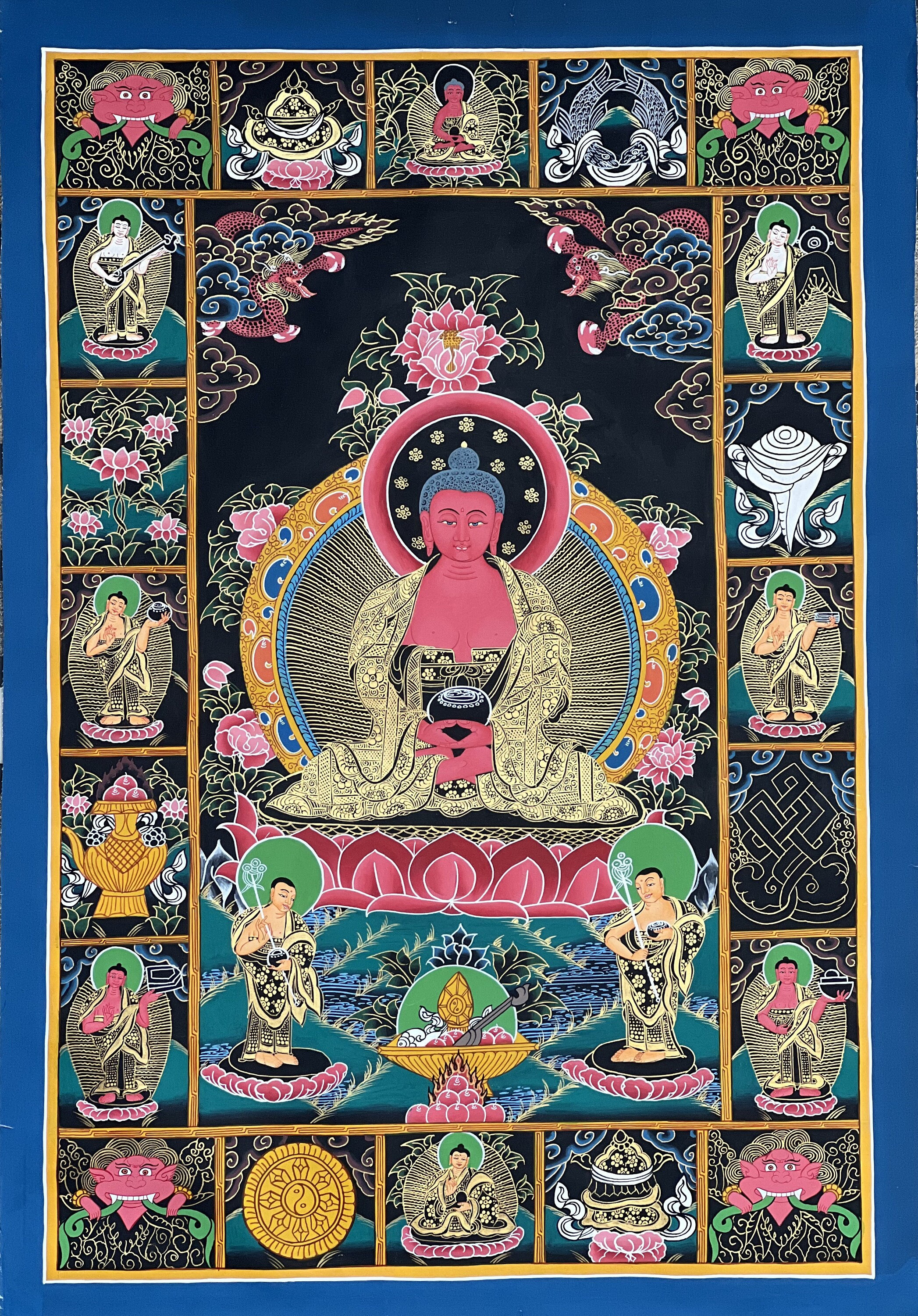 This exquisite work of art is a testament to the skill and devotion poured into crafting an original hand-painted Amitabha or Pure Land Buddha Tibetan Thangka painting. Amitabha, also known as Amitayus, assumes the revered role of the Buddha of Eternal Life, standing as one of the five Cosmic Buddhas within Esoteric Buddhism. This captivating depiction presents Amitabha in his celestial abode, Sukhavati, the Western Pure Land, where he is enthroned beneath a resplendent flowering tree adorned with strands of jewels and auspicious symbols. Amitabha - Buddha of Eternal Life: Amitabha, often addressed as Amitayus, embodies the archetype of the Buddha of Eternal Life. His benevolent presence and compassionate nature resonate with seekers on a spiritual journey. This Thangka captures the essence of his divine qualities, portraying him as a symbol of boundless compassion and the aspiration for ultimate enlightenment. Sukhavati - The Western Pure Land: The artist skillfully transports us to Sukhavati, the Western Pure Land, a celestial realm of immeasurable beauty and tranquility. Amitabha's throne is set amidst this paradisiacal landscape, creating a visual feast for the observer. The flowering tree, generously adorned with strands of jewels and auspicious symbols, symbolizes the abundance and spiritual richness that characterizes Sukhavati. The meticulous attention to detail, vibrant colors, and intricate patterns attest to the artisan's mastery and deep commitment to the spiritual essence of the subject matter. Each nuance in Amitabha's countenance and the celestial surroundings reflects a labor of love and a profound dedication to capturing the spiritual energy inherent in this divine portrayal. In summary, this original hand-painted Amitabha or Pure Land Buddha Tibetan Thangka painting is not merely a visual masterpiece; it is a spiritual journey. It beckons viewers to connect with the essence of Amitabha, the Buddha of Eternal Life and invites contemplation on the beauty and serenity of Sukhavati, the Western Pure Land. Through its craftsmanship and symbolism, the Thangka serves as a conduit for spiritual contemplation and a visual hymn to the eternal teachings of Amitabha." Size : 20 x 30 Inch ( 51 x 76 cm) Color: Natural, Stone color, Tibetan Glue Material: Handmade Cotton Canvas Frame: None Packaging: PVC Tube Shipping: Free Standard Shipping with International Tracking Number. Duty and Taxes: As applicable by the country of destination. Etsy Collects Tax/VAT for most countries while checking out.