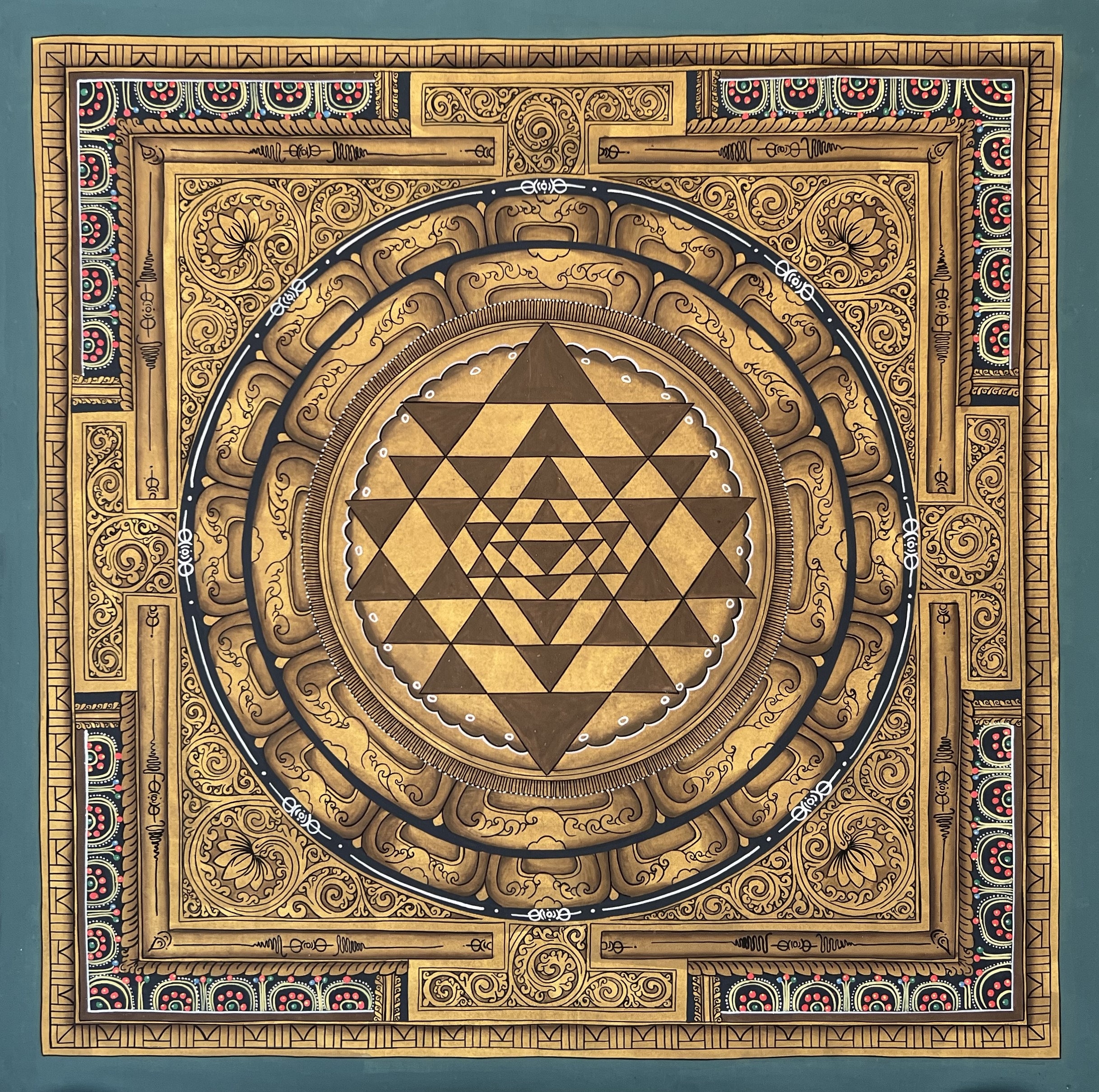 This magnificent artwork is a hand-painted Shri Yantra, also known as Sri Yantra or Shri Chakra Mandala. It has been captured on canvas in the traditional Newari Paubha/Pauva Thangka Painting style, known for its intricate details and vibrant colors, often used to depict deities and spiritual symbols. The Yantra holds a profound symbol that encapsulates the essence of cyclical existence, from birth to death. This intricate artwork transcends mere aesthetics, inviting you to immerse yourself in its sacred geometry and experience every detail that is a portal to life's profound mysteries. The Shri Yantra is a radiant emblem that unveils the divine mother principle, offering a cosmic source from which all energy, power, and creativity emanate. This sacred symbol represents the interconnectedness of all existence, inviting contemplation and reverence for the eternal dance of creation and dissolution, fostering a deep sense of connection. Embrace this unique piece and allow it to resonate within your space, radiating spiritual significance and profound energy as it bridges the earthly and the divine. Let the Shri Yantra guide you on a transformative journey, awakening the boundless potential within you and connecting you to the eternal wellspring of cosmic energy. Size of the painting: 19 x 19 Inch (48 x 48 cm) Material: Handmade Cotton Canvas Color: Silver, Tibetan Glue, Quality: High Quality Frame: None NOTE The actual painting may look better than the picture. Packed safely in a paper/PVC tube. Free standard shipping with tracking. The destination country may charge duty/taxes. Etsy collects tax/VAT for most countries at checkout.