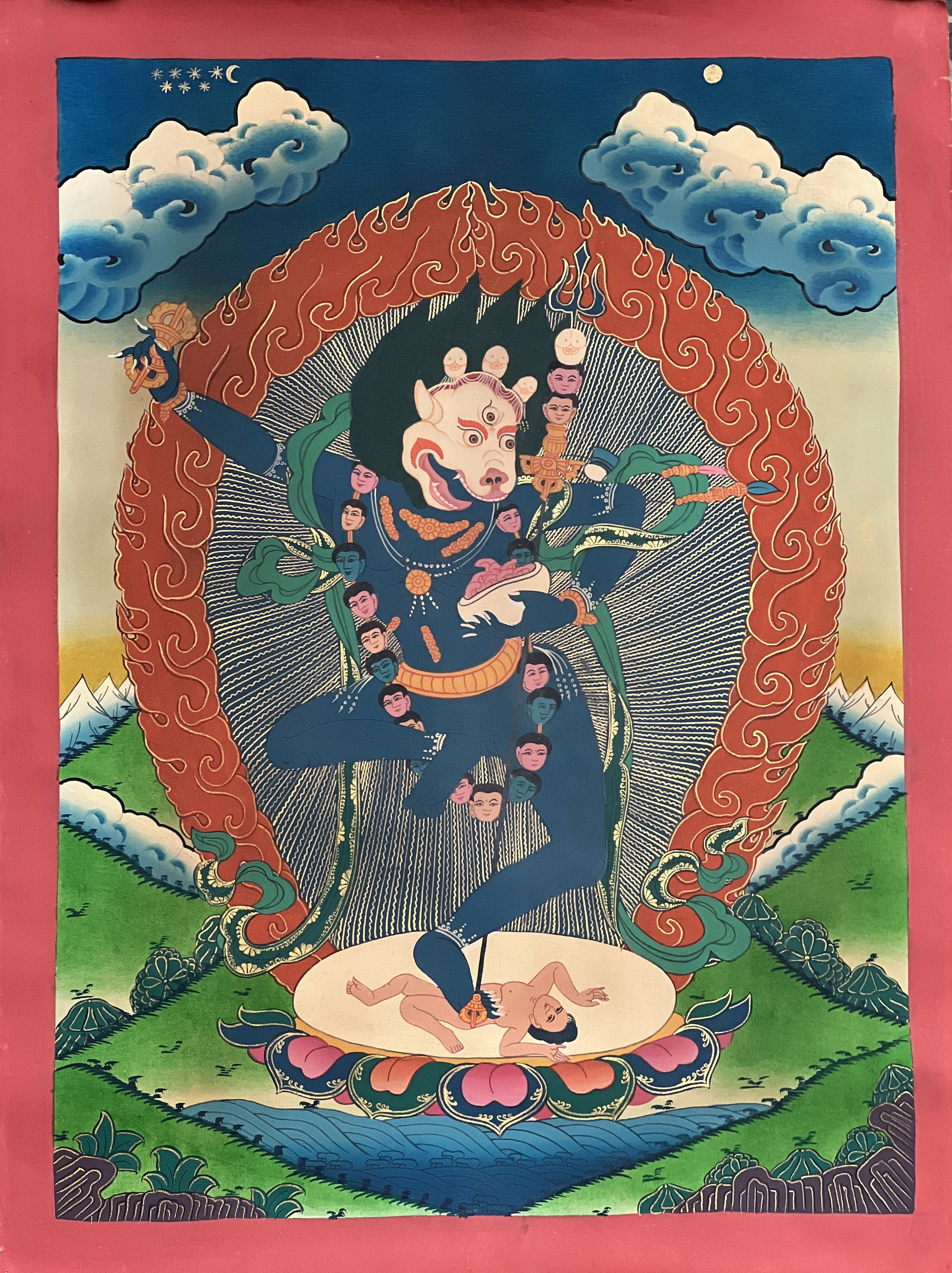 This breathtaking Tibetan Thangka painting from Nepal depicts Simha Mukhi or Simhamukha, a female Buddha and Dakini associated with Tantric practices. Simha Mukhi Yogini is renowned for improving humanity and dissolving the ego. Her teachings are particularly beneficial for those experiencing intense emotions, as she guides how to transform those emotions into enlightened qualities. This Thangka has a smoky appearance, providing extra protection and a subtle aesthetic. Size of the painting: 15 x 20- Inches ( 38 x 51 cm) Material: Handmade Cotton Canvas Color: Natural, Stone color, Tibetan Glue Frame: None NOTE The actual painting may look better than the picture. Packed safely in a paper/PVC tube. Free standard shipping with tracking. The destination country may charge duty/taxes. Etsy collects tax/VAT for most countries at checkout.